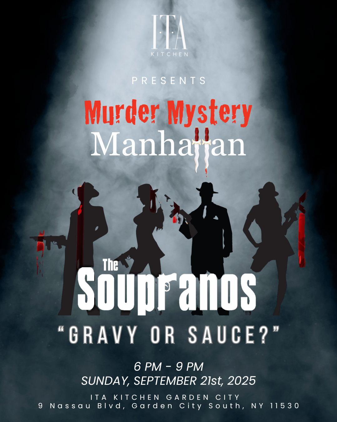 "The Soupranos: Gravy or Sauce?" Interactive Murder Mystery Dinner Show September 21, 2025 06:30 PM Reservations https://www.opentable.com/booking/experiences-availability?rid=1262818&restref=1262818&experienceId=539321&utm_source=external&utm_medium=referral&utm_campaign=shared
