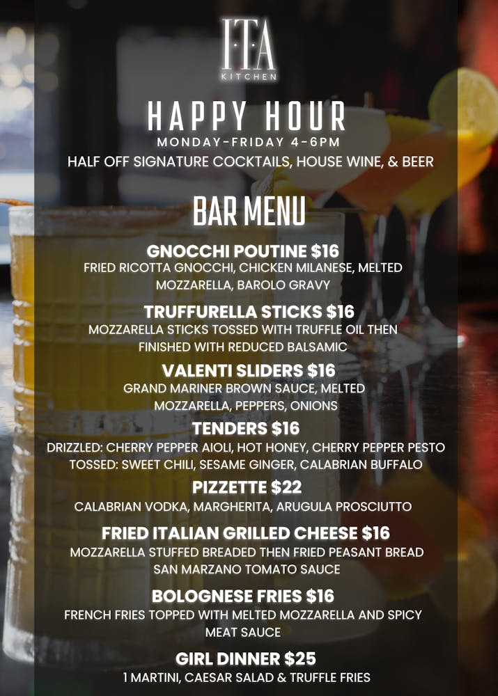 Join us Monday–Friday from 4–6 PM for half off signature cocktails, house wine, and beer.