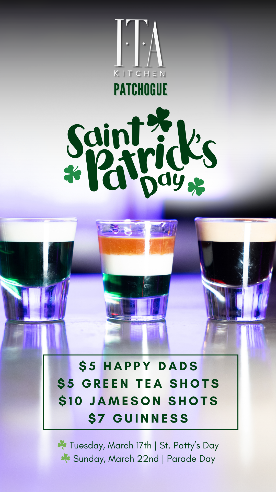 Join us at ITA Kitchen Patchogue as we celebrate St. Patrick’s Day with festive drinks, great food, and a lively atmosphere.